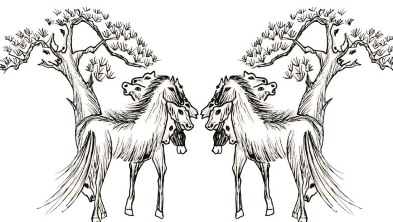 Iluzia optică este un tip de puzzle vizual care păcălește ochiul prin combinații de forme, modele și elemente camuflate. În provocarea de astăzi ai în față o imagine alb-negru, perfect simetrică, în care apar două scene identice cu cai, reflectate ca într-o oglindă. Sarcina ta este simplă, dar deloc ușoară: numără câți cai se ascund în această iluzie… și fă-o în doar 11 secunde.