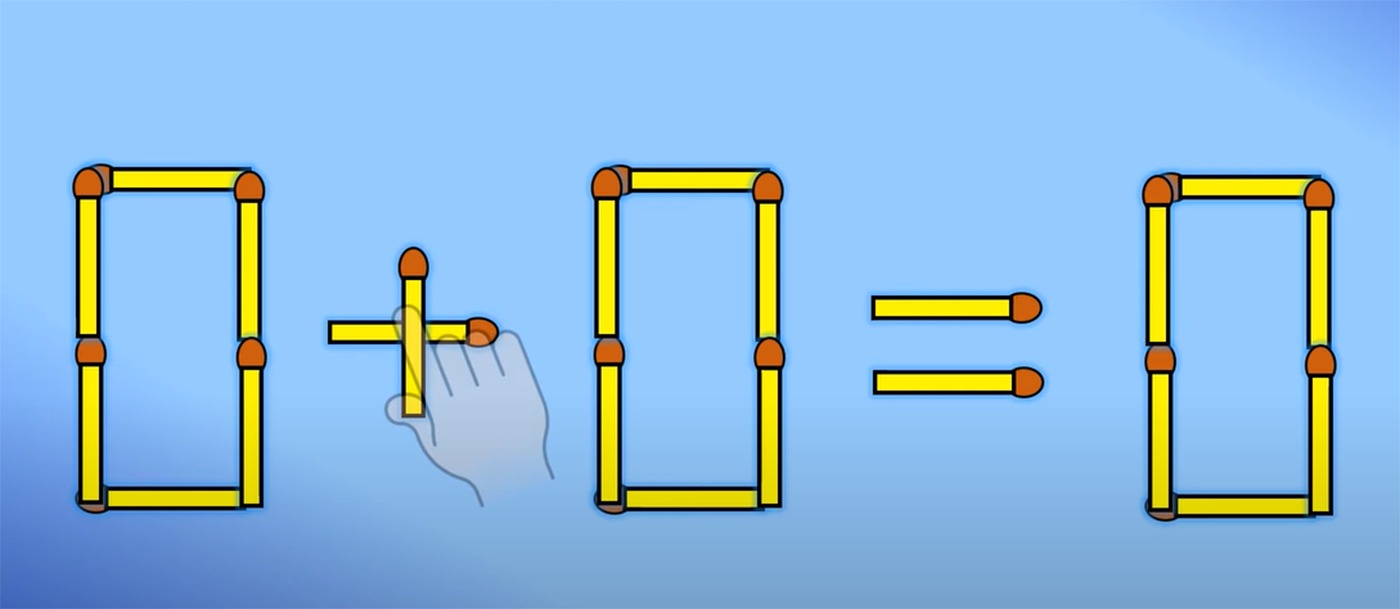 Pentru a corecta egalitatea, tot ce trebuie să faci este să iei bățul de chibrit așezat orizontal în mijlocul cifrei 8 și să îl așezi în poziție verticală deasupra semnului „-”. Astfel, egalitatea devine corectă 0+0=0.