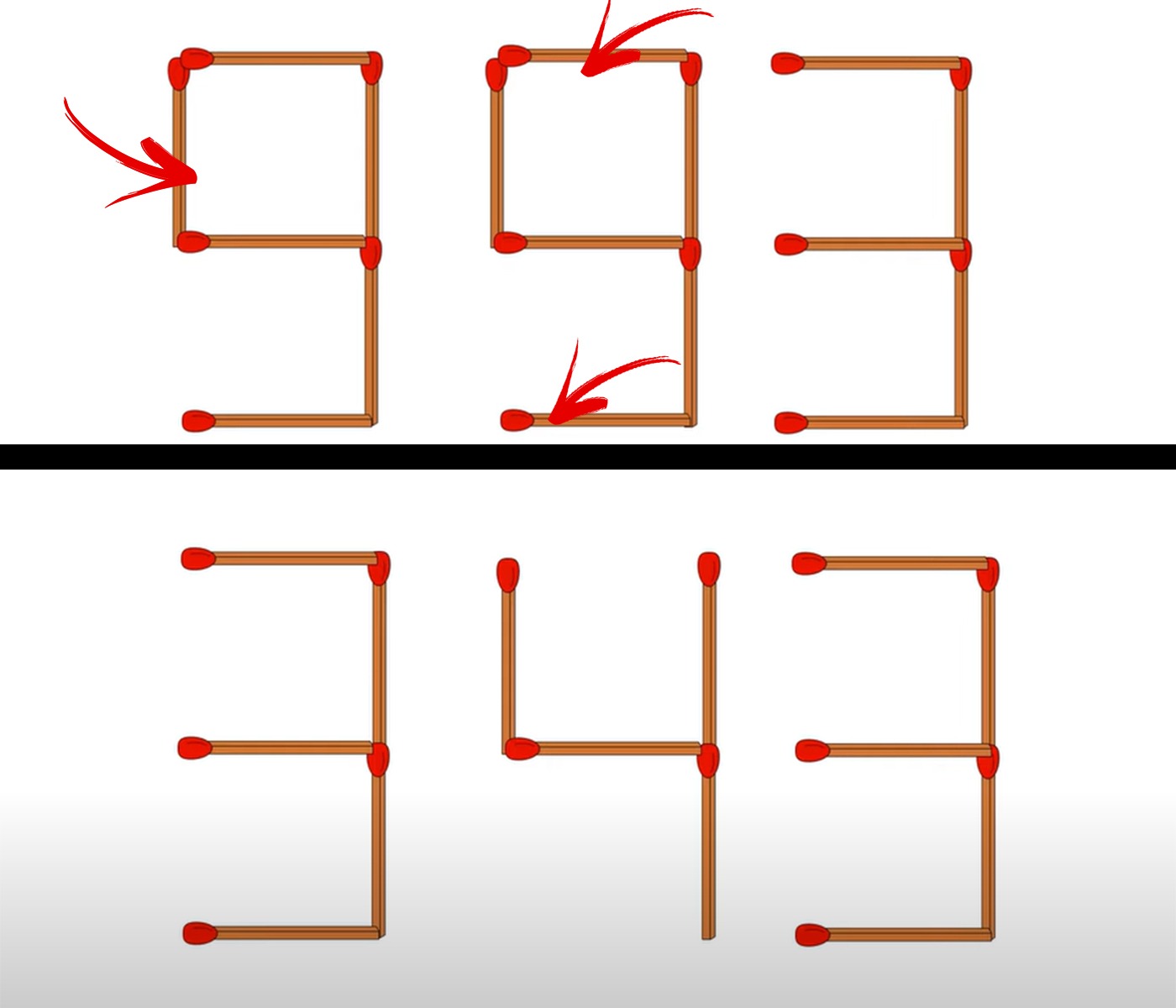 Astfel, vom elimina un chibrit din cifra 9, pentru a forma cifra 3, mai exact chibritul din partea stângă, pentru a ne rămâne ca rezultat cifra 3. Mai departe, ne oprim la următoarea cifră, de unde eliminăm două chibrituri. Astfel, chibritul orizontal din partea de sus va fi eliminat. Ultimul pas pentru a obține rezultatul dorit este să eliminăm chibritul orizontal din partea de jos a cifrei 9.