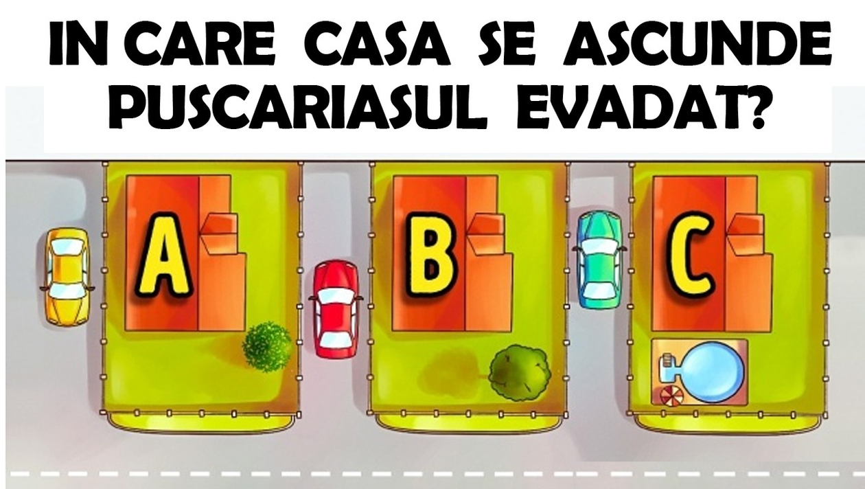 Rezolvare: Ei bine, pușcăriașul evadat se află în casa A, pentru că aceasta este singura a cărei mașină este parcată cu fața înspre stradă. Motivul?! Pentru a putea pleca repede, în cazul în care este găsit.
