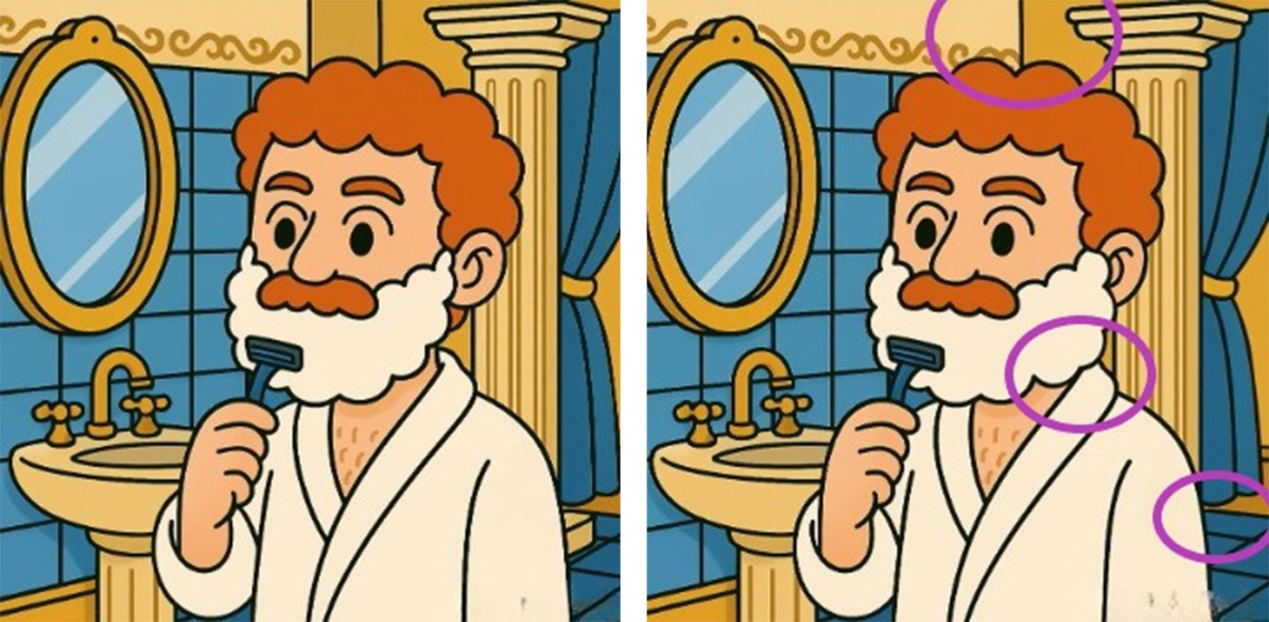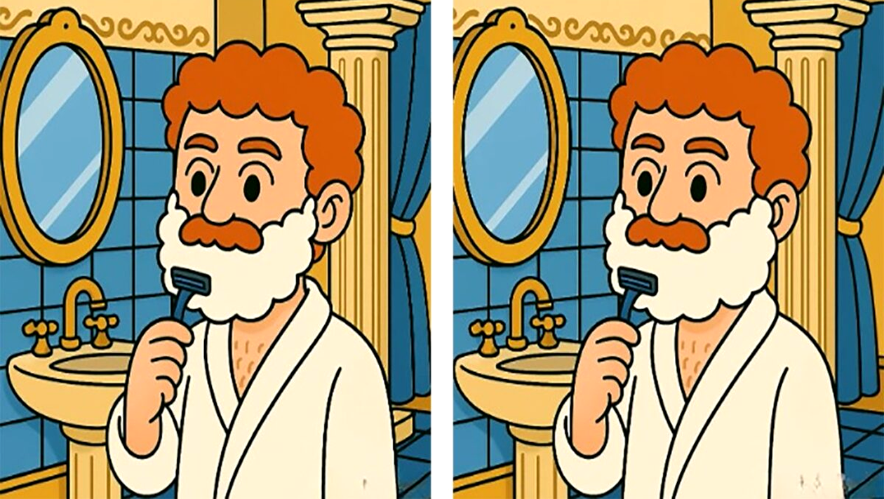 Ei bine, prima diferență poate fi observată la barbă. În a doua fotografie este mai lună decât în cealaltă. O altă diferență o reprezintă plăcile de gresie din partea dreaptă imaginii. A treia diferență poate fi observată la perete. Priviți cele două poze mai jos pentru a înțelege mai bine!