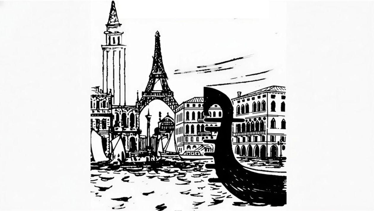 Greșeala din imagine este că gondolele se găsesc în Veneția, însă în imagine apare Turnul Eiffel – care se află în Paris, nu în Veneția.