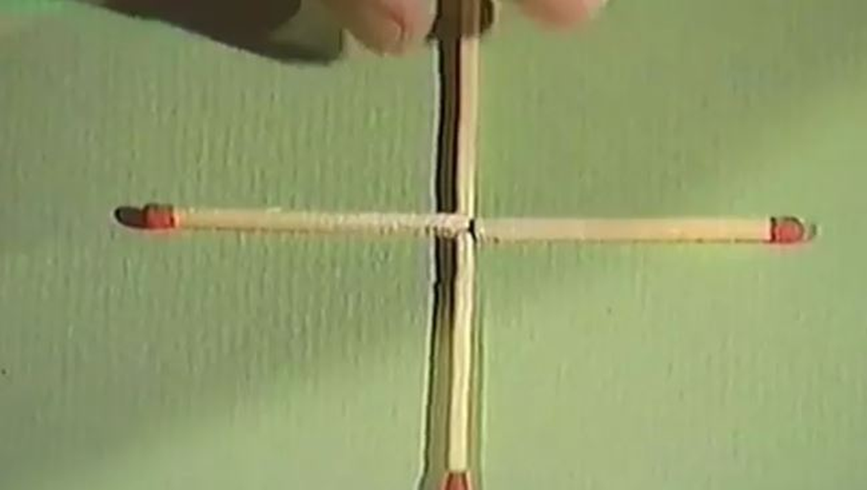 Cerința este ca, mutând un singur băț de chibrit din cele patru așezate sub forma unei cruci, să se obțină un pătrat.
