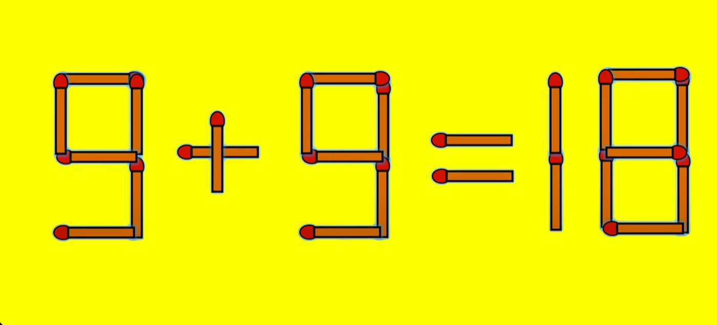 Pentru a corecta egalitatea, tot ce trebuie să faci este să iei bățul de chibrit așezat vertical, din partea stânga-jos din componența cifrei 8 și să îl așezi tot în poziție verticală la cifra 5. Astfel, cifra 8 se transformă în cifra 9, iar cifra 5 se transformă în cifra 9. Acum egalitatea este corectă: 9 + 9 = 18.