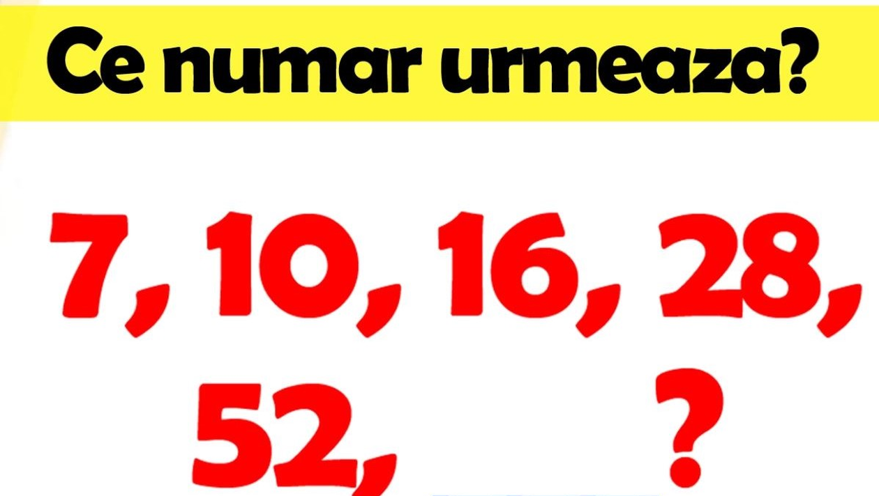 Iată un nou test de inteligență! De data aceasta, trebuie să aflați ce număr urmează în seria aceasta: 7, 10, 16, 28, 52. Testul de inteligență vă solicită atenția și gândirea logică.