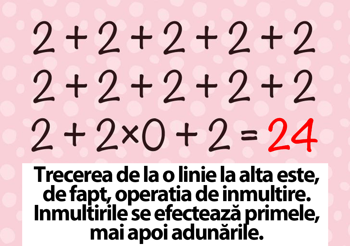 Trecerea de la o linie la alta este, de fapt, operația de înmulțire. Înmulțirile se efectuează primele, mai apoi adunările. După ce ai respectat toate operațiile matematice, răspunsul final trebuie să fie 24.