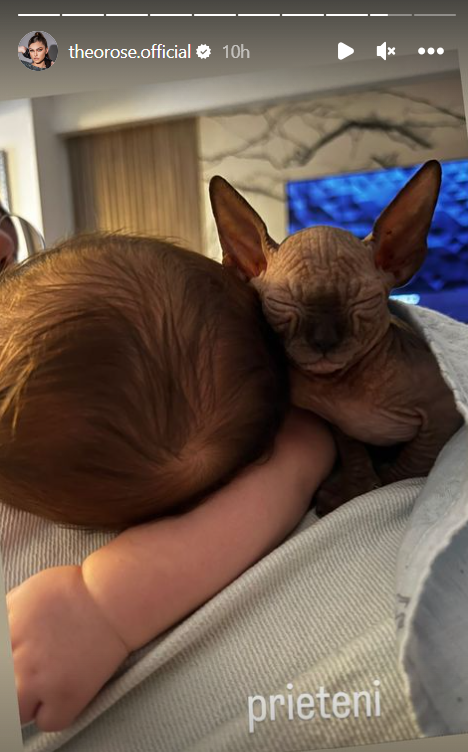 „Am ajuns acasă la 4 și ceva de dimineață. I-am dat să mănânce lui Sasha. Sushi dormea pe Anghel, pe gâtul lui. M-am demachiat, m-am spălat, să mă pun la somn. M-am pus la somn, după o oră m-am trezit. Nu că plângea Sasha… că plângea Sushi! Am dus-o la litieră, am adus-o înapoi, a adormit din nou pe Anghel. După încă o oră, plângea iar Sushi, îi era foame. Oare așa va fi viața mea în continuare? O să mă trezească ăștia din oră în oră?! Că dacă fac cu schimbul așa, tu o oră, eu o oră, la fix…”, a spus Theo Rose, pe Instagram.