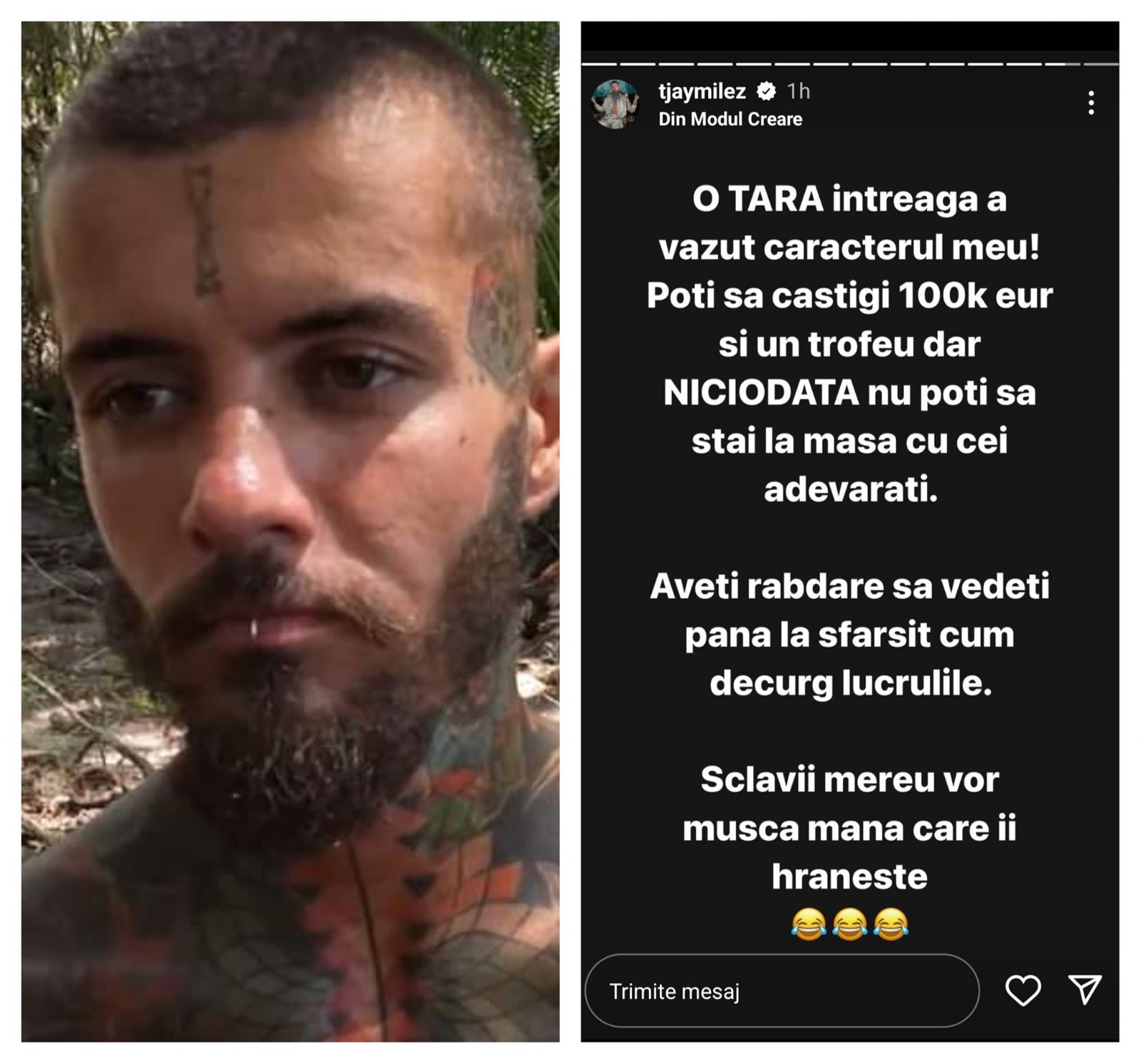 „O țară întreagă a văzut caracterul meu! Poți să câștigi 100.000 de euro și un trofeu, dar niciodată nu poți să stai la masă cu cei adevărați. Aveți răbdare să vedeți până la sfârșit cum decurg lucrurile. Sclavii mereu vor mușca mâna ca îi hrănește.”, a scris TJ Miles pe contul său de Instagram.