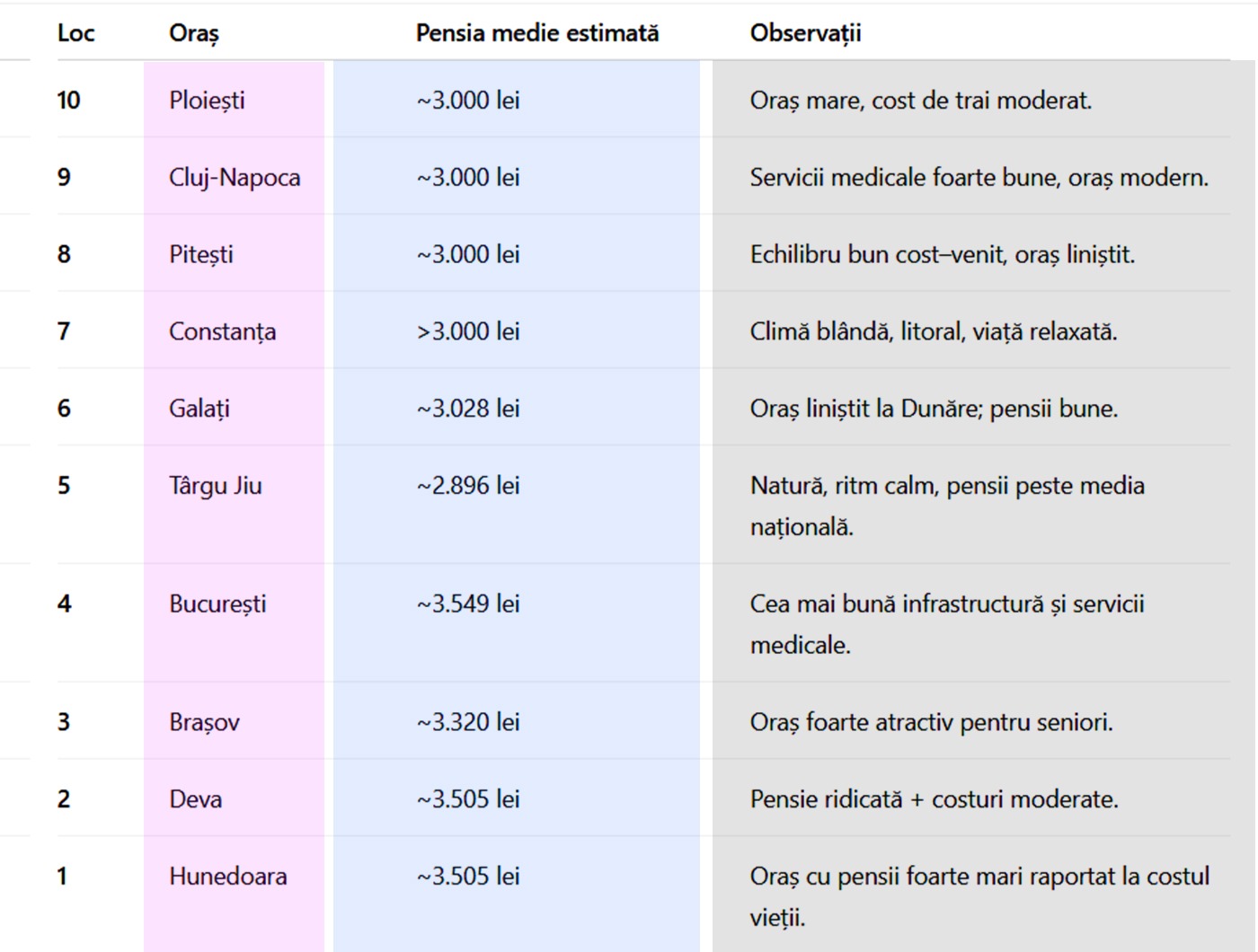 În fruntea clasamentului se află pensionarii din Hunedoara, oraș unde – raportat la costul vieții – seniorii au venituri destul de mari (3.505 lei).