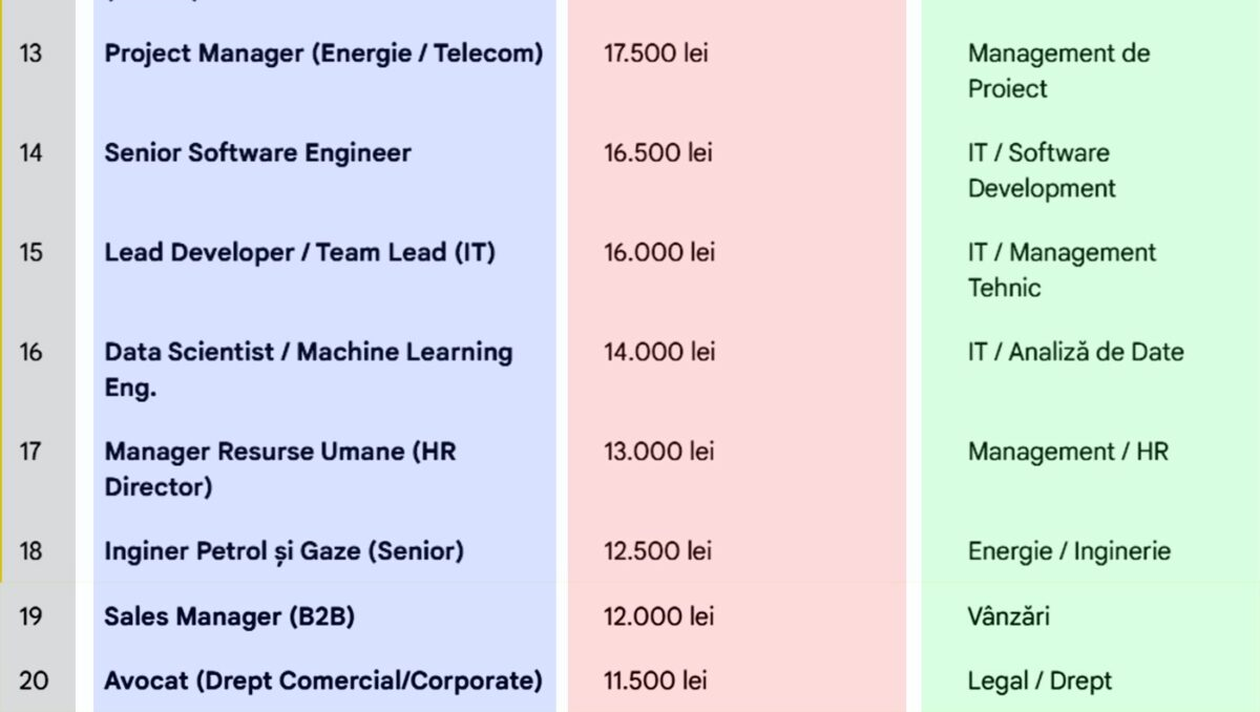 Nici pozițiile de suport strategic nu lipsesc din top. Managerul de Resurse Umane (HR Director) are un salariu de 13.000 lei, iar Sales Manager (B2B) câștigă 12.000 lei. În zona juridică, avocații specializați în drept comercial și corporate încheie topul cu 11.500 lei.