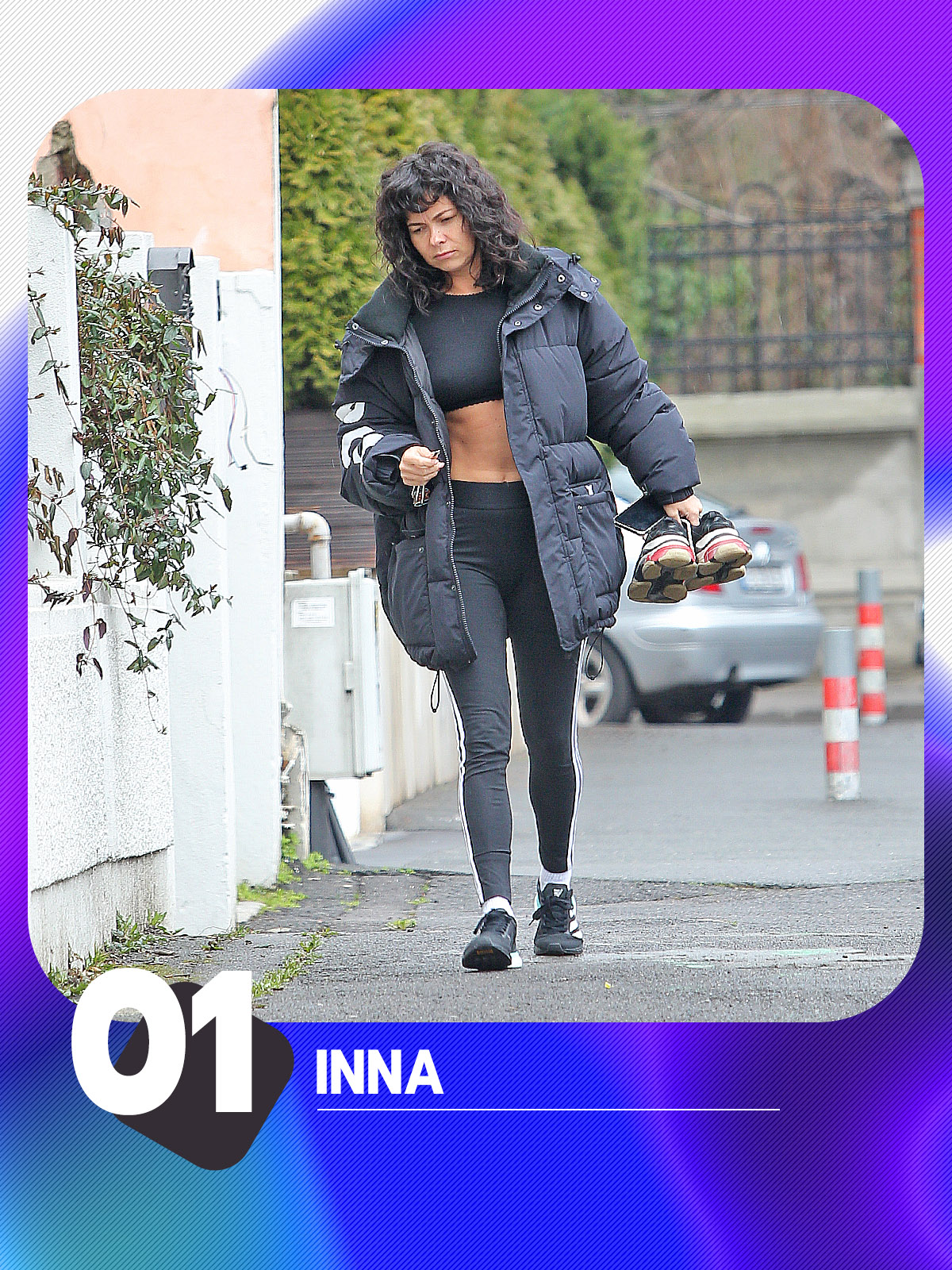 Mergem mai departe la o altă artistă de renume: Inna. În aceste imagini, cântăreața e numai bucle și când o vezi așa ți-ai dori ca timpul să devină o buclă, ca în filmul ”Ziua Cârtiței”. Iubita lui Deliric are mijlocul tras printr-un inel, iar în imagine se vede și că nu e așa doar de la Mama Natură, se și ajută. Inna vine de la sală, e cu pantofii sport într-o mână și cheile în cealaltă. Poartă un costum de fitness negru care îi flatează picioarele bine proporționate. Incredibil, dar acești colanți au cei șapte ani de acasă, pentru că nu acoperă buricul minuscul și atât de cute al Innei. Mijlocul arămiu, bronzat timpuriu, trădează corpul super tonifiat. E clar, Inna a rezolvat deja beach body-ul!