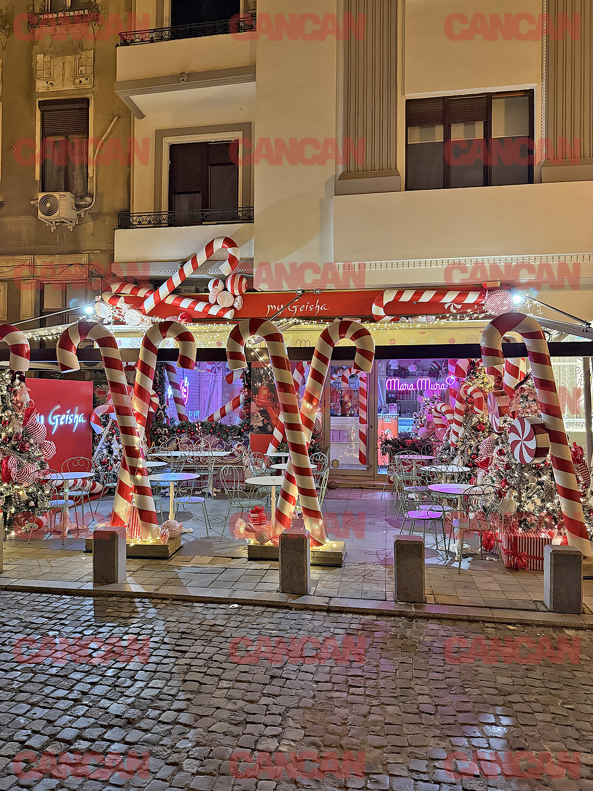 Rămânem tot în zona Centrală și ajungem la Mara Mura în colaborare cu My Gheisha. Toată lumea știe de locațiile Mara Mura că oferă unele dintre cele mai delicioase dulciuri, iar iarna vin cu un plus: Locații de Crăciun perfect amenajate care îți vor lua ochii. De data aceasta, au decis să transforme totul într-o infuzie de zahăr vizual: bastoane uriașe de acadea roșu cu alb se arcuiesc peste terasă ca o poartă spre o lume unde Moș Crăciun are în sac muuulte dulciuri. Brazii împodobiți în aceleași tonuri alb cu roșu, cadourile perfect coordonate cromatic și luminile calde creează vibe-ul unui Candy Wonderland cu tentă glam. Fiecare detaliu este atent gândit, încât nu ai cum să ratezi o astfel de locație iarna aceasta.