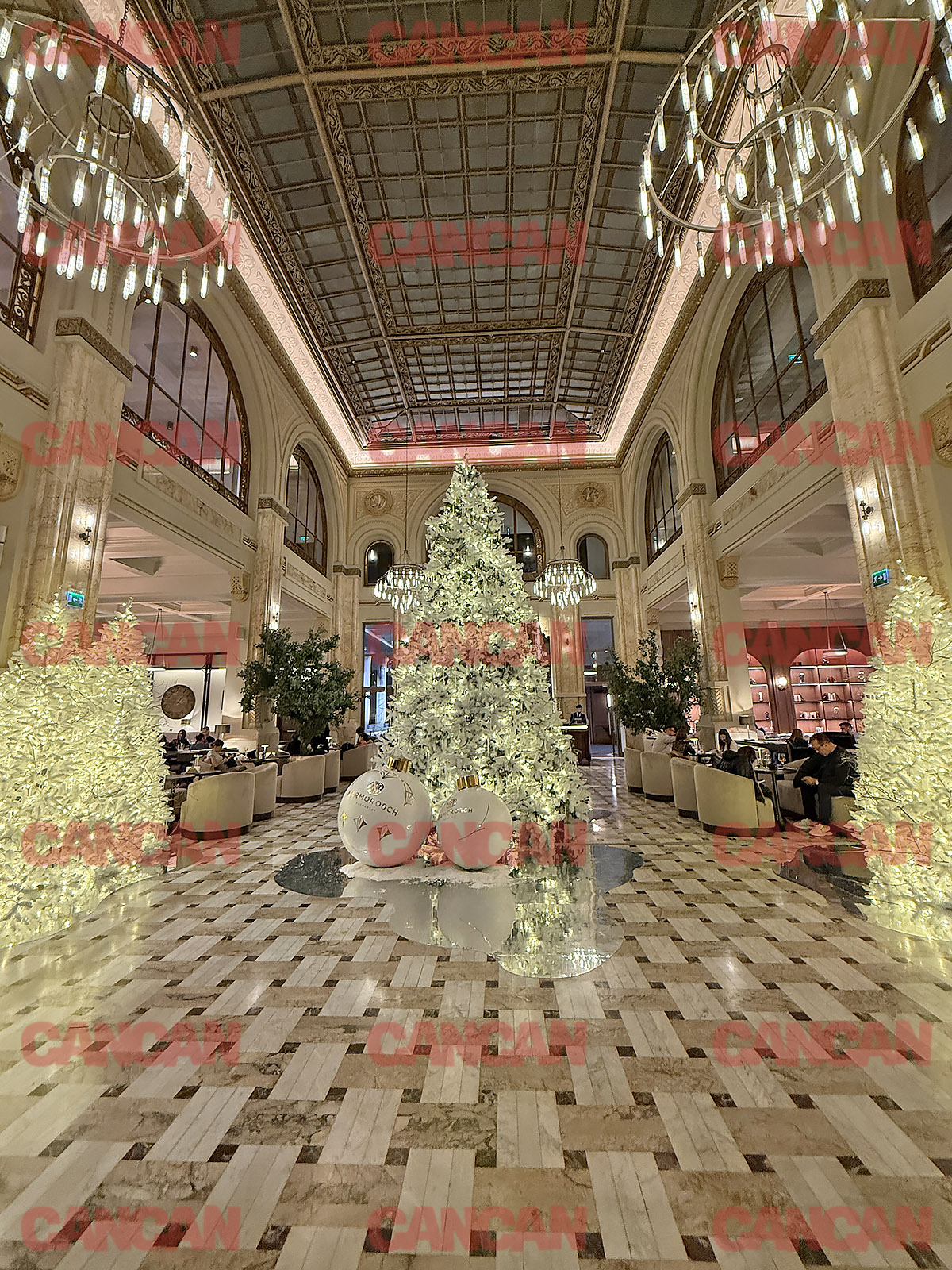 În interior, în holul principal, e montat un brad impunător de Crăciun, înalt de aproximativ șapte metri care aduce farmecul sărbătorilor în superba clădire istorică. Designul decorului urmează tema Winter Wonders: predomină nuanţele de alb, auriu și champagne, un mix de sobrietate și magie, fără să exagereze.