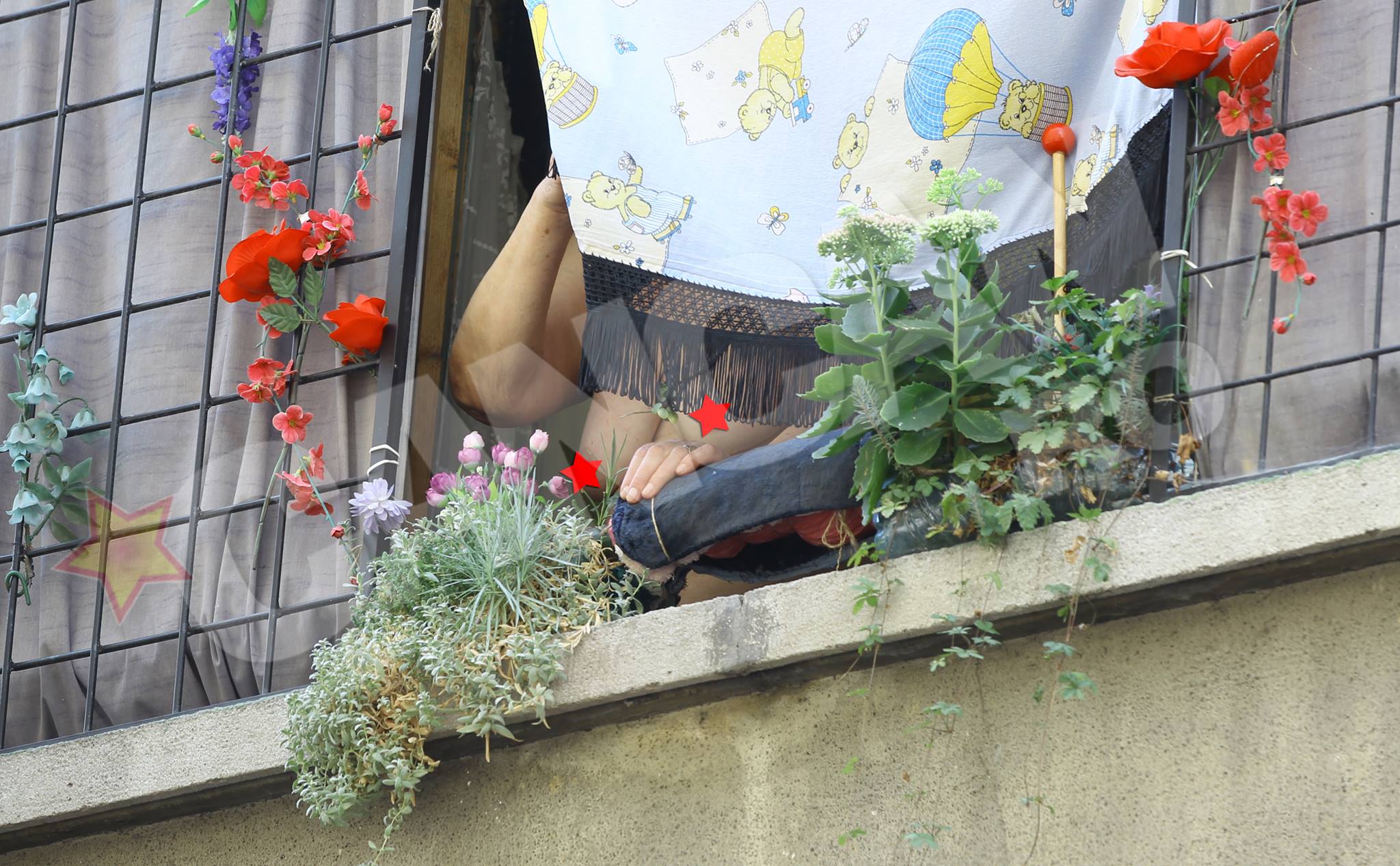 Pentru ca si privirea a inceput sa ii slabeasca, la etajul 1, tortionarul a „instruit” o vecina vigilenta, care ii da „note informative” despre orice trecator. Ascunsa dupa un batic cu franjuri atarnat la balcon, intr-un decor ieftin de flori de plastic si bujori proaspeti, o doamna trecuta de 60 de ani, atentie, in sanii goi, cel mai probabil din cauza caniculei, supravegheaza intrarea in blocul „penitenciar” unde comandant este Visinescu.