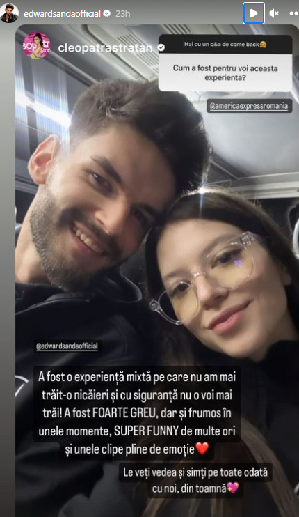 „Ne-am întors cu toții. Abia aștept să vedeți cum a decurs aventura noastră. A fost o experiență minunată pe care nu am mai trăit-o nicăieri și cu siguranță nu o voi mai trăi! A fost FOARTE GREU, dar și frumos în unele momente, SUPER FUNNY de multe ori și unele clipe pline de emoție. Le veți vedea și simți odată cu noi, din toamnă. Cea mai mișto parte din America Express a fost că am trăit experiența împreună! Noi 2 ne-am distrat la maxim (o să râdeți mult cu noi) și o să ne vedeți așa cum ne știți. Ne-am apropiat și mai mult. Aș vrea să vă povestesc toate momentele, însă trebuie să aveți puțină răbdare până la difuzare. Vă garantez că va merita așteptarea”, a spus Cleopatra Stratan.