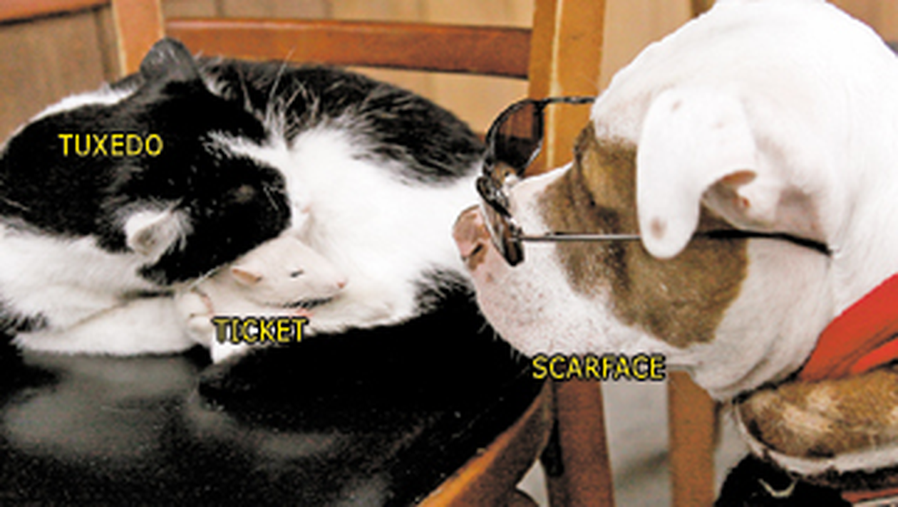 Este vorba despre un caine rasa pitbull, pe nume Scarface („Insemnatul”), de o pisica pe nume Tuxedo („Smoking”) si de un soricel numit Ticket („Bilet”). Desi pare ireal, pentru ca animalele cu pricina se urasc de moarte in general, cei trei se inteleg de minune. „S-au imprietenit imediat si stau tot timpul impreuna, avand grija unii de altii”, a povestit stapanul lor, Brian Cottrill.