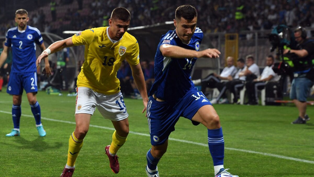 Amer Gojak of Bosnia and Herzegovina (R) fights for the ball with Razvan Marin (L) of Romania during the UEFA Nations League 2022 - League B group 3 match between Bosnia and Herzegovina and Romania in Zenica on June 7, 2022.,Image: 697784014, License: Rights-managed, Restrictions: , Model Release: no, Credit line: Profimedia