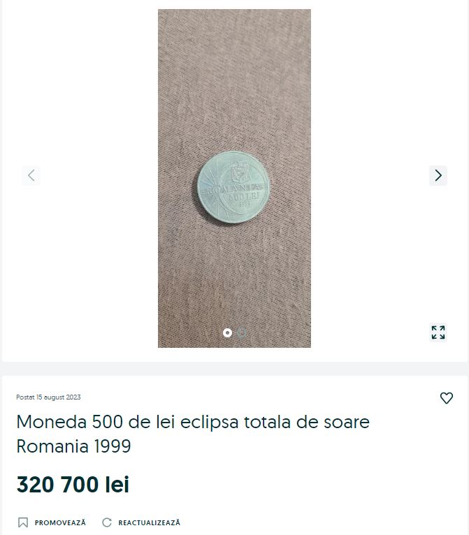 Un utilizator al platformei oferă spre vânzare o monedă de 500 de lei din anul 1999, cu Eclipsa Totală de Soare. Prețul acesteia nu este deloc de neglijat. Persoana care a încărcat anunțul cere pentru o astfel de monedă suma de 320.700 de lei. Mai cu seamă, nu mai puțin de 65.000 de euro!