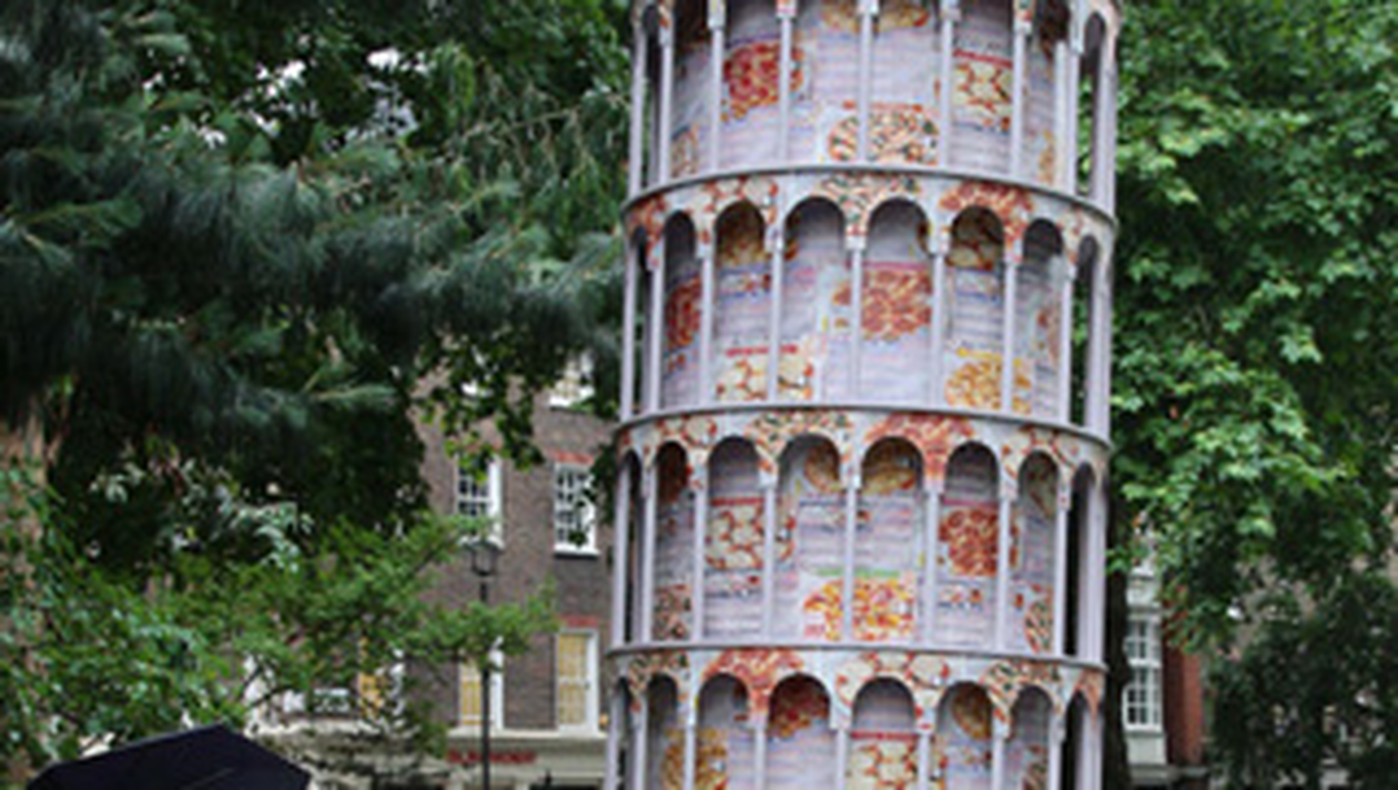 Mai multi britanici cu initiativa au realizat o replica a celebrului turn din Pisa, din Italia, din cutii de carton. Inedita constructie a fost expusa in Soho Square din Londra si a fost principalul punct de atractie pentru trecatori.