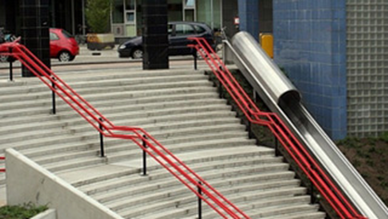 Ei s-au gandit sa instaleze un „accelerator de transfer” pentru pasagerii grabiti. De fapt, este vorba doar despre un simplu tobogan care a fost montat de o firma de constructii care dorea sa inveseleasca cartierul Overvecht, unul cu o reputatie mai putin buna in Utrecht. De idee s-au bucurat indeosebi copii, care il folosesc ca loc de joaca, dar si persoanele mai in varsta si-au adus aminte de copilarie si nu au ezitat sa foloseasca acest dispozitiv.