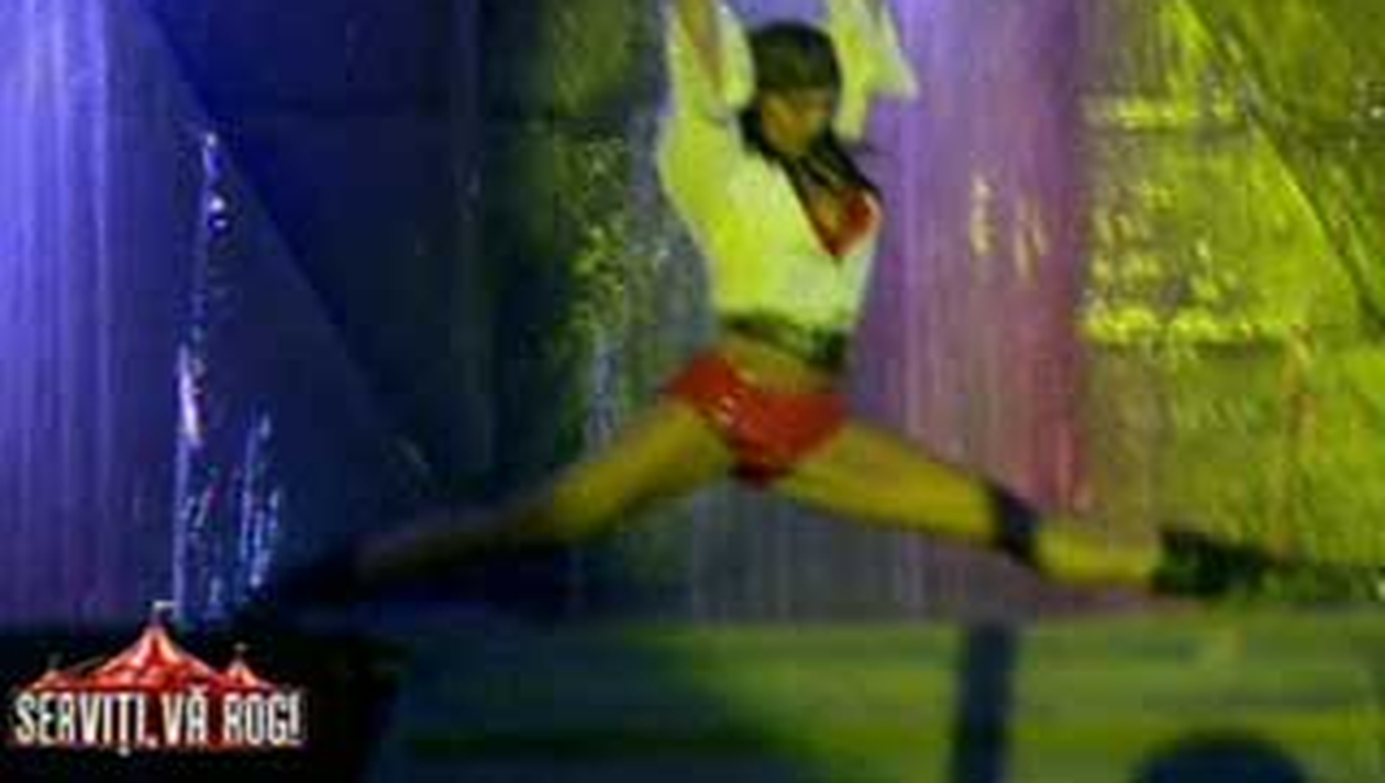 Gabriela Irimia si-a luat chiar foarte in serios jobul si, imbracata doar intr-o pereche foarte decoltata de chilotei, a facut spagatul, s-a tavalit pe scena si a dat tot ce a putut.