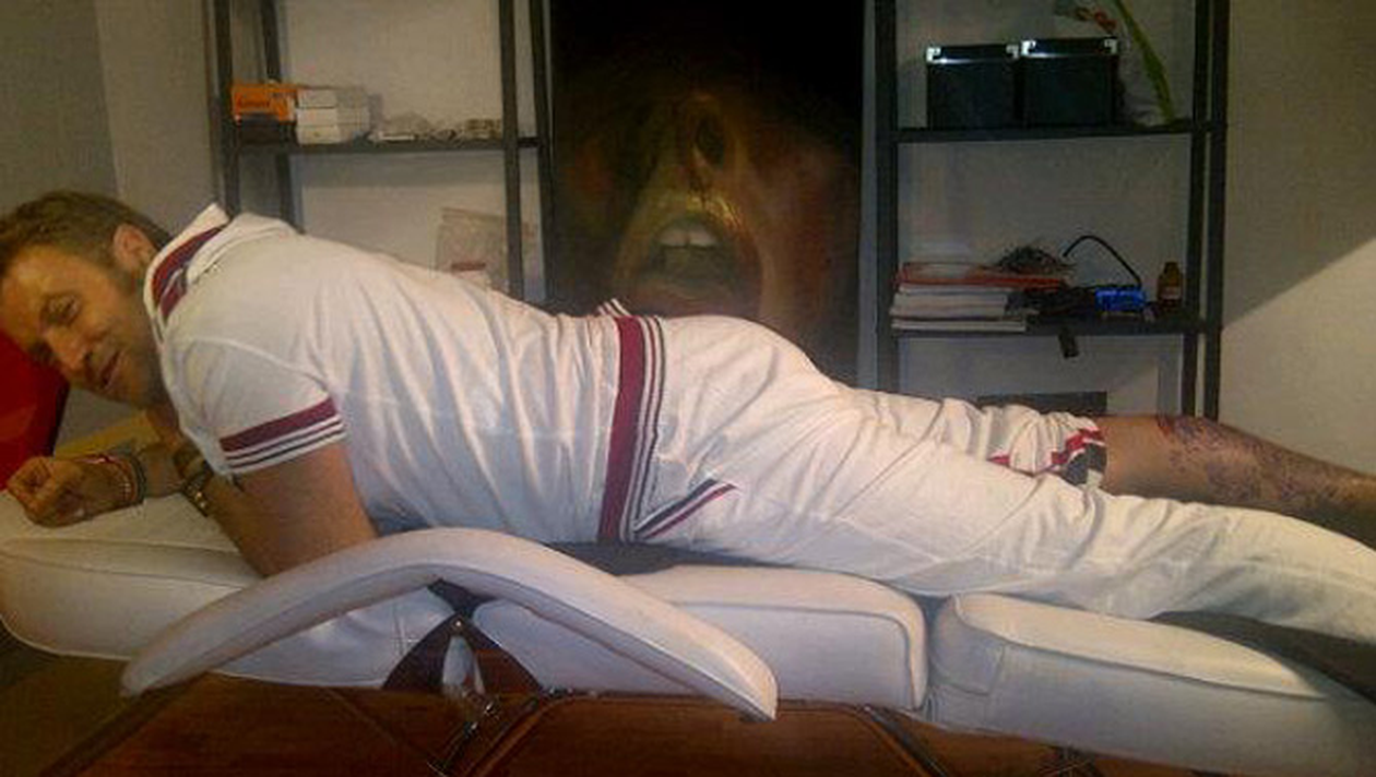 Designerul a fost surprins in timp ce statea intins pe scaun cu noul tatuaj la vedere. Dupa fata lui ne putem da seama ca a indurat ceva durere in timpul sedintei.