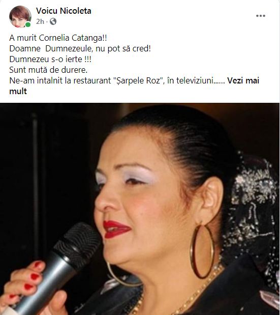 ”A murit Cornelia Catanga!! Doamne Dumnezeule, nu pot să cred! Dumnezeu s-o ierte!!! Sunt mută de durere. Ne-am întâlnit la restaurant Șarpele Roz, în televiziuni… Nu pot să cred!!!!”, a scris Nicoleta Voicu. (CITEȘTE ȘI: AUREL PĂDUREANU, DISTRUS DE MOARTEA CORNELIEI CATANGA! PRIMA REACȚIE A ARTISTULUI)