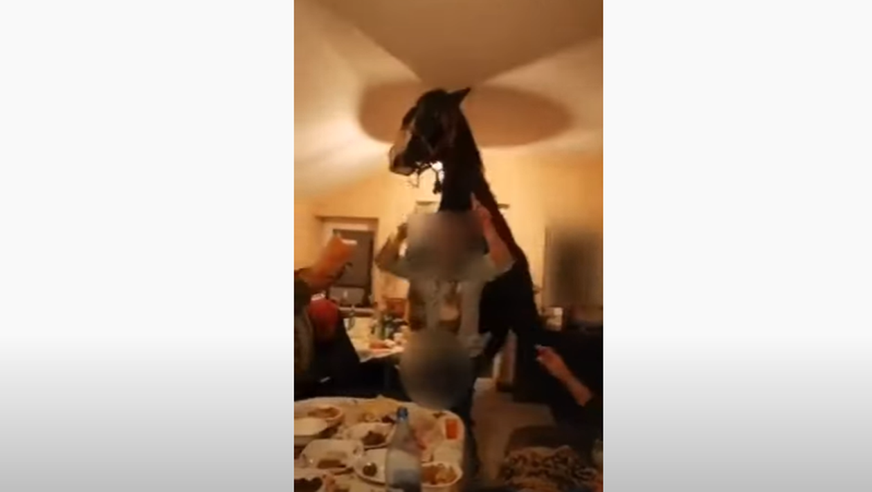 Opt bărbaţi din Călăraşi s-au filmat cu un cal la masă, în timp ce dădeau o petrecere în sufragerie. Petrecăreţii au făcut un live pe Facebook, iar imaginile au devenit imediat virale. Autorităţile au intervenit în acest caz.