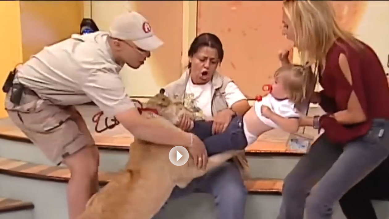 Membrii familiei au participat, în calitate de invitaţi, la programul „Con Sello de mujer” la o televiziune din Mexic, iar în platou, a fost lângă ei şi un…pui de leu. Animalul, care era foarte jucăuş, a avut într-o fracţiune de secundă o reacţie deosebit de agresivă, repezindu-se să-l muşte pe micuţ. Aceste imagini impresionante demonstrează că atunci când situaţia pare sub control, totul se poate schimba foarte rapid. Din fericire, dresorul şi prezentatorul au intervenit imediat, cu sânge rece, evitând o tragedie, şi au prevenit tragedia. Acest videoclip face parte dintr-un program difuzat pe 12 martie 2003 la TV Azteca., dar a fost descoperit recent. (Gabriel Niculescu)