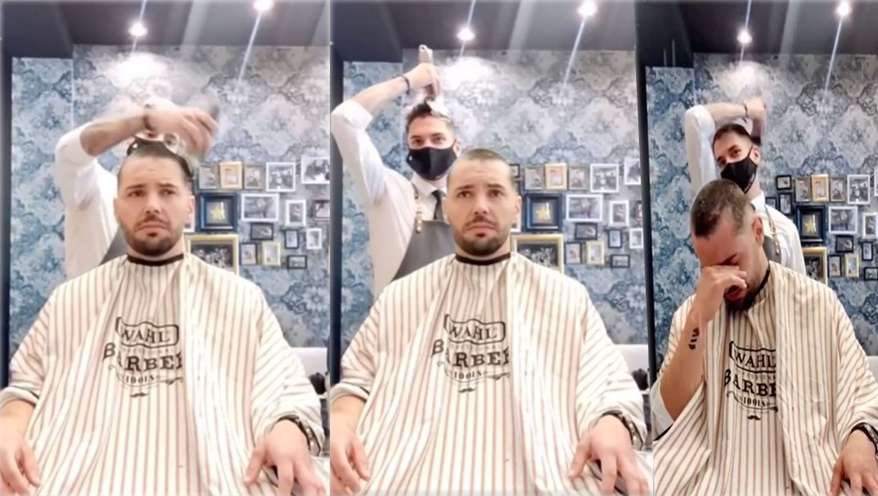 Încremenit de decizia bărbierului, clientul îl privește cum se tunde la zero timp de câteva secunde, după care izbucnește în lacrimi și lasă capul în jos, acoperindu-și fața cu mâna dreaptă, după cum puteți urmări în galeria foto a articolului, dar și pe înregistrarea de mai jos.