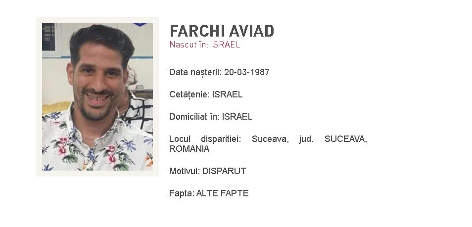 Farchi Aviad, un cetățean israelian, este dat dispărut în România. Bărbatul – în vârstă de 37 de  ani – tranzita țara noastră pentru a ajunge în Ucraina, acolo unde ar fi trebuit să ia parte la pelerinajul organizat cu ocazia noului an evreiesc. La finalul săptămânii trecute, bărbatul a ajuns în Suceava cu o cursă charter, apoi a trecut granița spre Ucraina. Citește și: Tânărul de 19 ani, dispărut la un festival din Tenerife, a fost găsit fără viață. Cu cine a fost văzut ultima oară + ultimele sale cuvinte