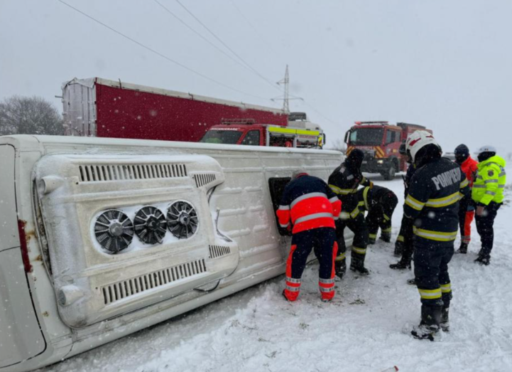 Accidentul a avut loc sâmbătă, 21 februarie, în zona localității Plopșoru, județul Giurgiu. Un microbuz plin cu 16 pasageri a derapat și s-a răsturnat pe marginea drumului. În urma ninsorilor din această dimineață, șoseaua era acoperită de un strat de zăpadă. Reamintim că județul Giurgiu se află sub cod galben de ninsori și viscol până mâine, 22 februarie.