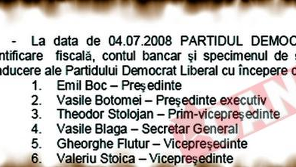DISTRAT. Theodor Stolojan i-a dat o nesperata mana de ajutor lui Botomei sa se cocoate la varful partidului Un ilustru anonim apare in mod stupefiant in documentele Registrului partidelor politice de la Tribunalul Bucuresti si la Biroul Electoral Central ca fiind numarul 2 in PD-L, dupa Emil Boc, iar liderii partidului nu prea reusesc sa explice fenomenul. Bogdan Tiberiu Iacob Potrivit art. 51 din legea 14/2003, a partidelor politice, Registrul partidelor politice este instrumentul legal de evidenta a partidelor politice din Romania. Institutia cu drept de a opera in acest registru este numai Tribunalul Bucuresti. Bomba apare in respectivul registru in dreptul PD-L: potrivit documentelor de la tribunal (facsimil), depuse pentru actualizarea datelor despre conducerea partidului in ziua de 4 iulie a.c., PD-L este condus de Emil Boc, presedinte si Vasile Botomei, presedinte executiv, urmat de prim-vicepresedintele Theodor Stolojan, secretarul general Vasile Blaga si restul conducerii cunoscute a partidului. Lipseste complet Videanu! Cei tentati sa creada ca e vorba de o eroare de redactare a documentului pot face o verificare in documentele similare de la Biroul Electoral Central, numai ca – stupoare! – acolo se regaseste aceeasi situatie. Din investigatiile noastre, misteriosul Vasile Botomei este un controversat avocat bacauan, care a produs un scandal in primavara, sustinand ca el este cel care a inregistrat PD-L la tribunal, cu el in conducere. In luna aprilie, Botomei declara presei locale: „Sunt pe locul 2, dupa Emil Boc. Acum sunt presedintele executiv la nivel national al PD-L”.