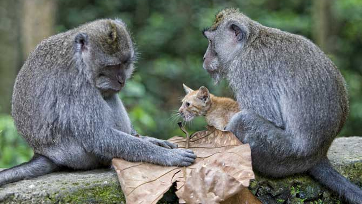 Imagini absolut impresionante au fost surpinse de fotograful amator Anne Young, in timpul vacantei pe care a petrecut-o in zona Ubud, din Bali. Ea a reusit sa suprinda o familie de maimute care a adoptat un pui de pisica. Maimutele s-au dovedit a fi extrem de atente cu felina, ingrijind-o mai ceva ca pe un copil. Intr-una dintre imagini, maimuta femela o poarta in brate cu mare grija pe pisicuta, iar in alta fotografie, o strange tare la pieptul ei, de parca ar vrea sa o ocroteasca de orice fel de rau. Intr-un alt instantaneu, felina apare alaturi de familia ei adoptiva, „parintii” sai ingrijindu-se nu doar sa o tina in brate, ci si sa o acopere cu o frunza uscata, ca nu cumva sa-i fie frig.
