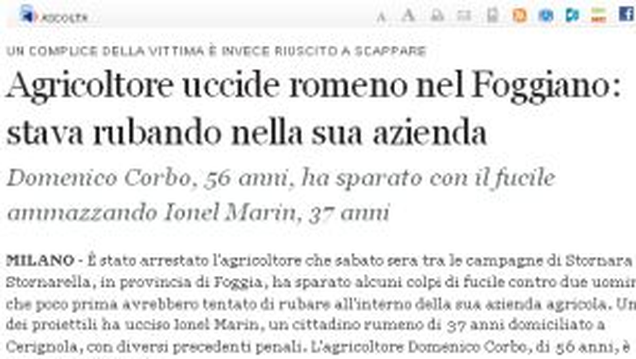 Proprietarul fermei a tras doua focuri de arma pentru a-i speria pe hoti, iar romanul, Ionel Marin, in varsta de 37 de ani, cu mai multe condamnari la activ, a fost nimerit in plin, in vreme ce al doilea hot a reusit sa fuga, anunta Corriere della Sera.