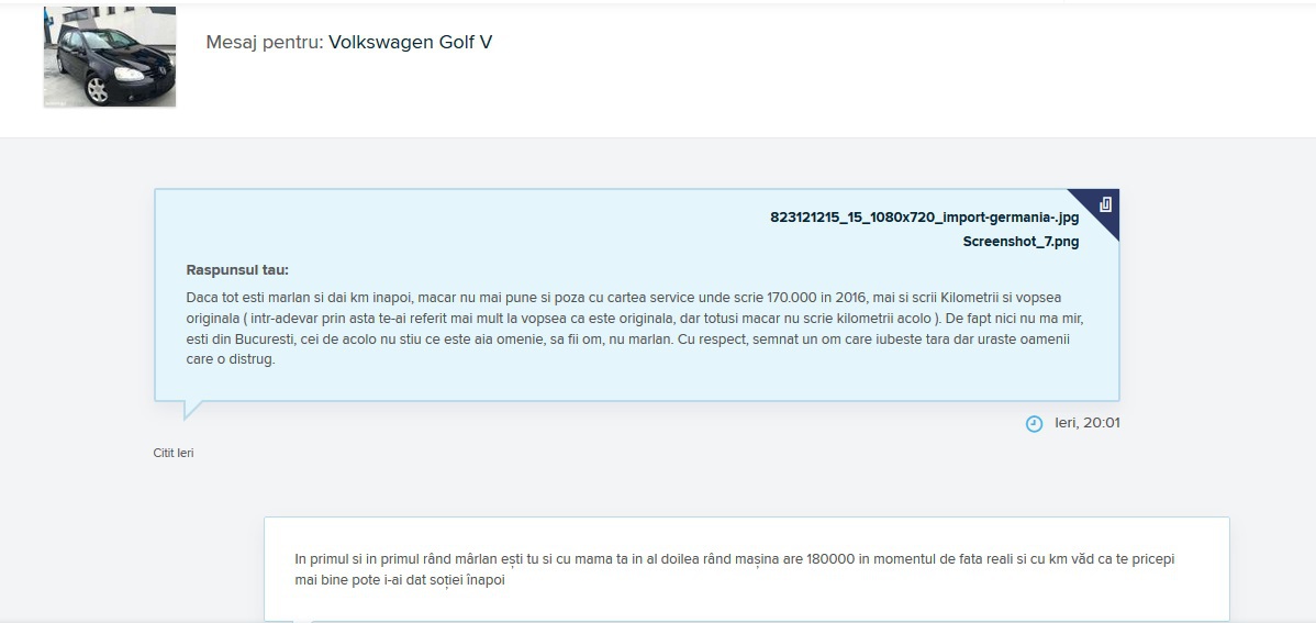 Dacă tot ești mârlan și dai km înapoi, măcar nu mai pune și poza cu cartea service unde scrie 170.000 în 2016, mai și scrii kilometri și vopsea originală (într-adevăr prin astea te-ai referit mai mult la vopsea că este originală, dar totuși nu scrie kilometri acolo). De fapt nici nu mă mir, ești din București, cei de acolo nu știu ce este aia omenie, să fii om, nu mârlan. Cu respect, semnat un om care iubește țara, dar urăște oamenii care o distrug”, a fost mesajul clientului pentru proprietarul mașinii.