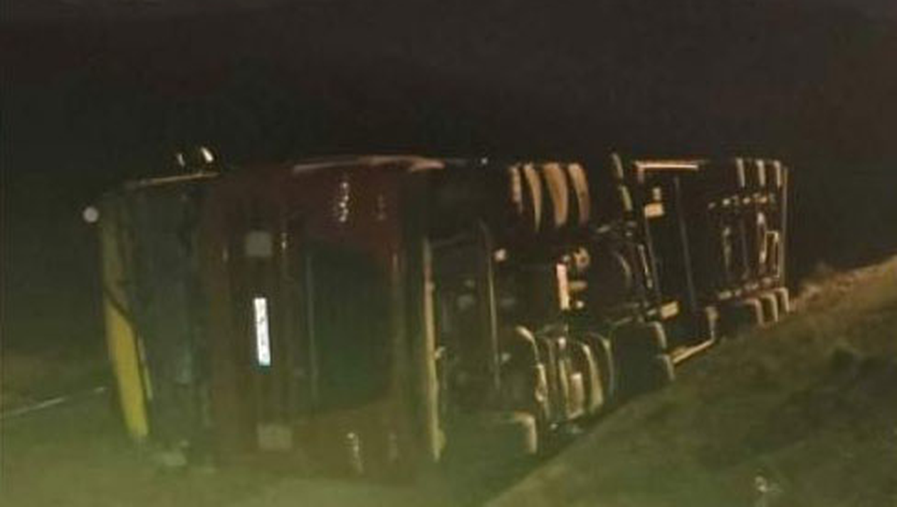 Un şofer de TIR beat a răsturnat camionul plin cu diluanţi, la Cluj, pe centura Apahida. O tonă de substanţă inflamabilă a ajuns pe şosea, dar, din fericire, nu a luat foc. Există risc de poluare.
