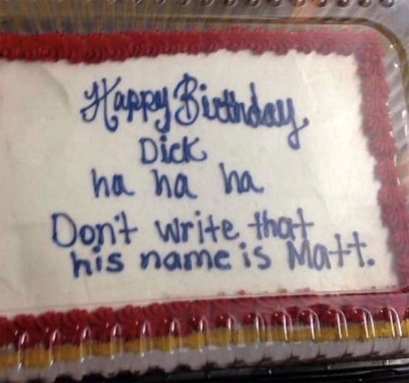 Se pare că, prietenul respectiv a încercat să facă o glumă, lăsând bucătarului următorul mesaj: ”La mulți ani, Dick. Ha ha ha ha. Nu scrieți asta, îl cheamă Matt”, doar că, bucătarul a luat gluma în considerare, la propriu. Pe tortul lui Matt a fost scrisă și partea în care trebuia să fie doar spre „deliciul” bucătarului.