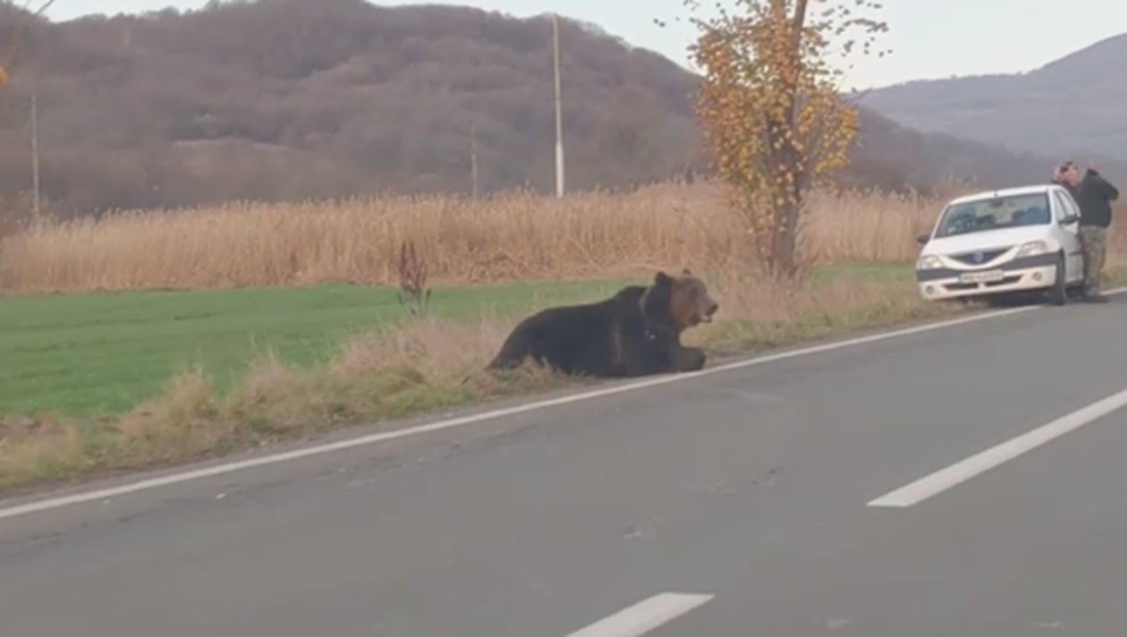 Un urs lovit de mașină pe un drum din Harghita agonizează pe carosabil de aproape 24 de ore, fără ca autoritățile să intervină pentru salvarea sa. Ursul este păzit de polițiști și jandarmi.