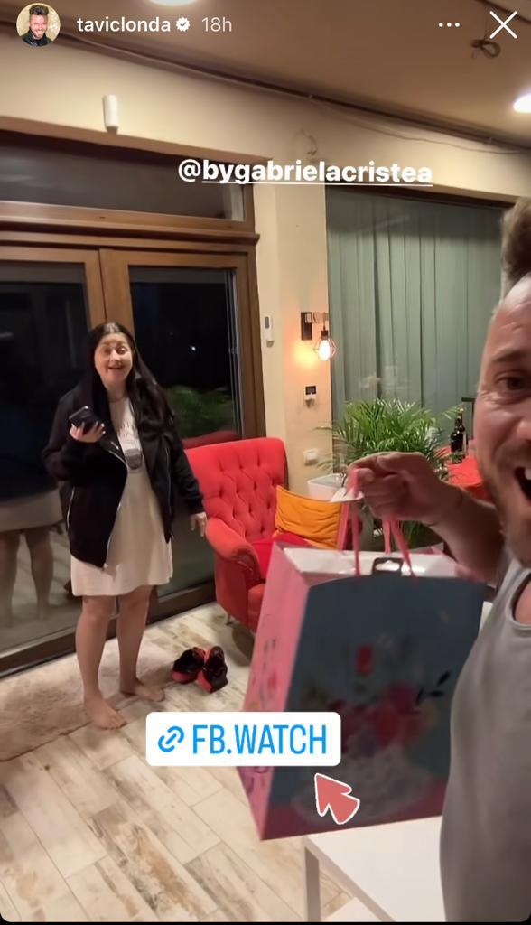 „E ora 12 noaptea, e ziua soției mele, e ziua Gabrielei! I-am luat un cadou, dar știți care e problema? În fiecare seară eu o culc pe Victoria, și ea pe Iris și nu mai coboară. Oare a adormit și ea acolo? I-am luat cadou, o aștept, dar dacă ea nu coboară i-l dau mâine. (n. r. Gabriela Cristea apare, iar Tavi Clonda începe să cânte La mulți ani)”, a mai spus Tavi Clonda.