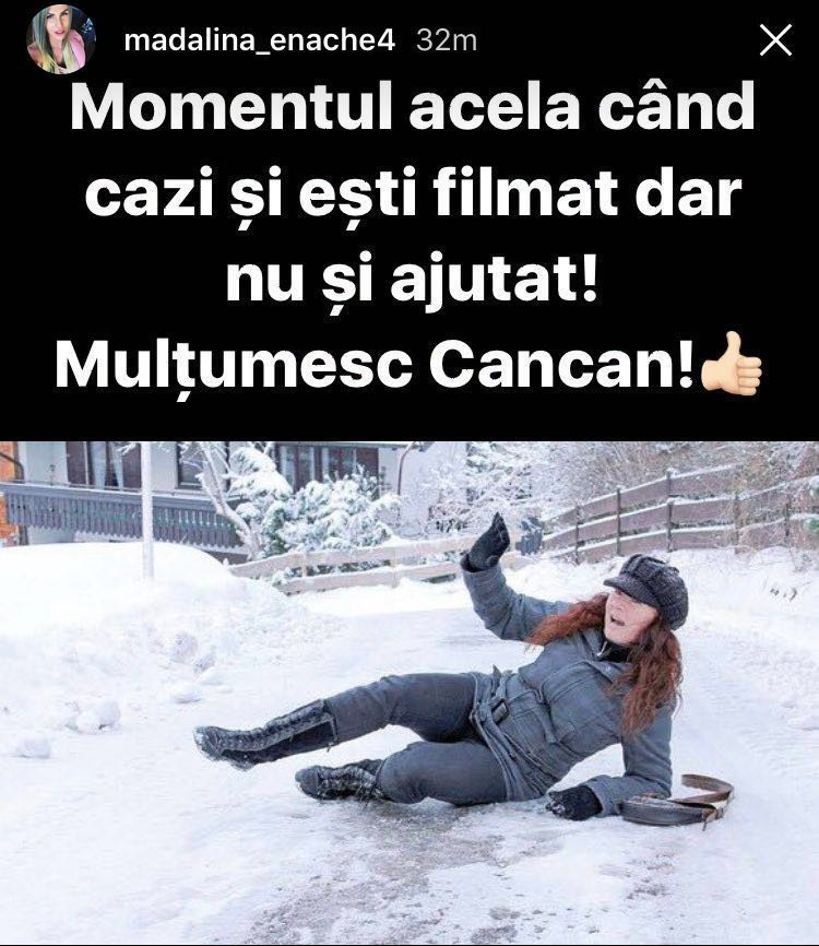 Vigilentă, a realizat că site-ul nr. 1 din România, CANCAN.RO, a filmat-o în timpul căzăturii şi a comentat, cu umor, acest lucru. „Momentul acela când cazi şi eşti filmat dar nu şi ajutat! Mulţumesc Cancan!”, a scris Mădălina Enache pe Instagram.