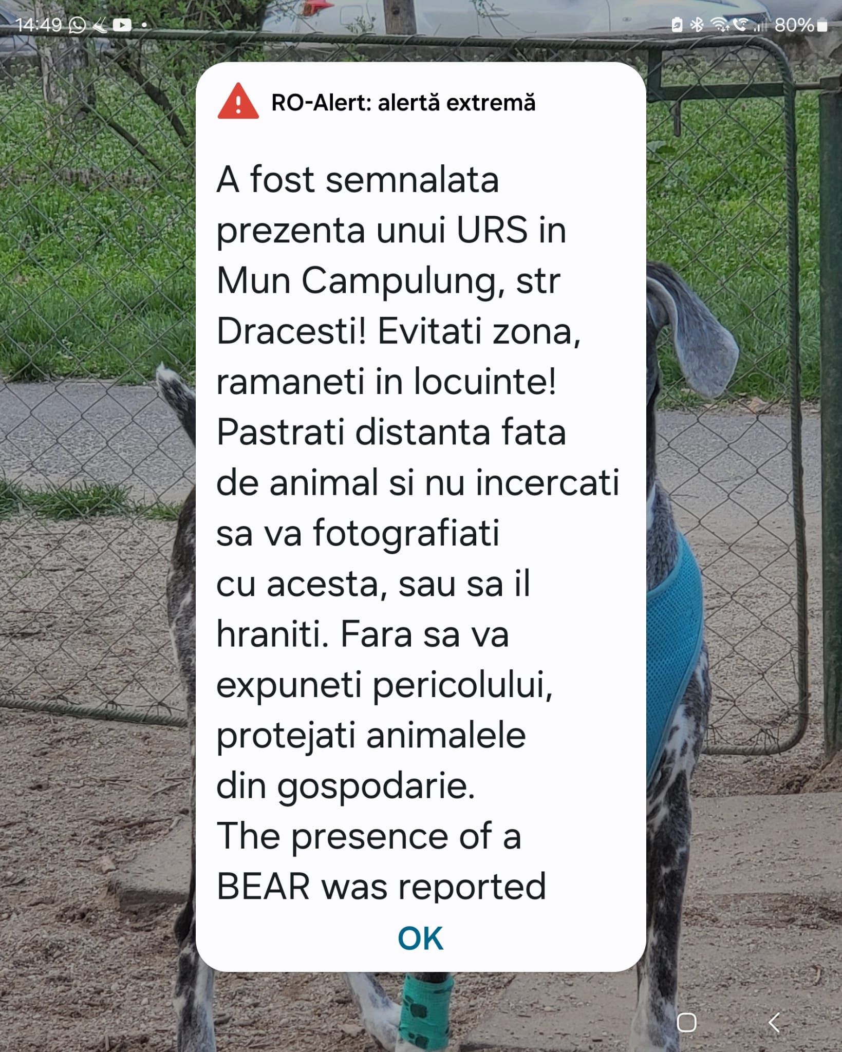Păstrați distanța față de animal și nu încercați să vă fotografiați cu acesta, sau să îl hrăniți. Fără să vă expuneți pericolului, protejați animalele din gospodărie”, se arată în mesajul primit de către locuitori.