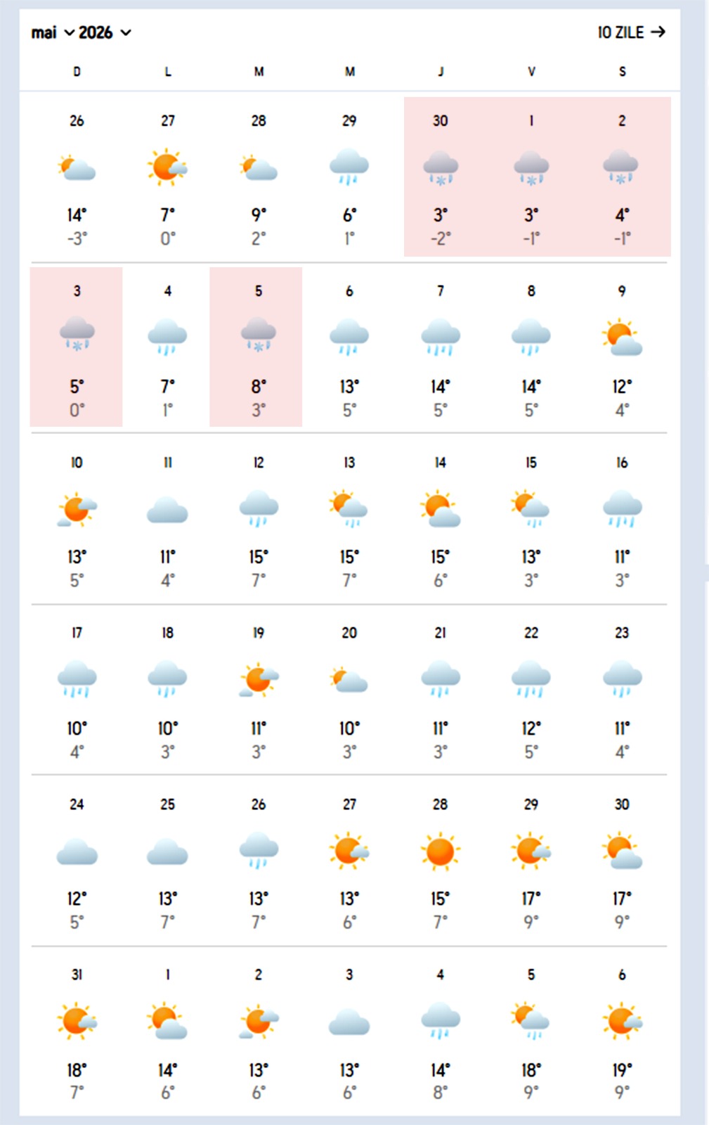 Primele zile din mai sunt cele mai reci, cu temperaturi care coboară până la 0 grade Celsius în timpul nopții și maxime de doar 4–6 grade. În intervalul 1–5 mai, prognoza arată precipitații mixte, iar în unele zile apare simbolul de ninsoare, semn că în zonele montane, inclusiv Predeal, pot apărea episoade de iarnă târzie.