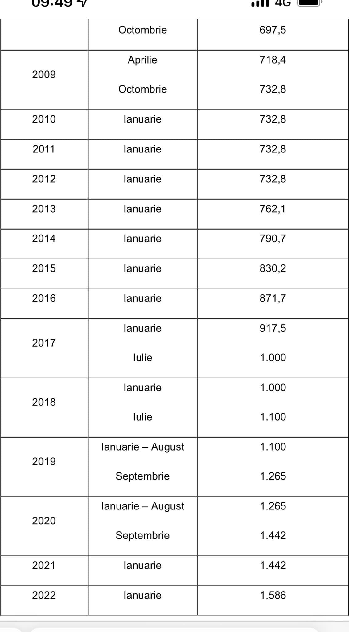Potrivit tabelului, în aprilie 2009 punctul de pensie era de 718.4 lei, iar în octombrie a ajuns la 732.8 lei. S-a menținut la această valoare timp de trei ani, iar în ianuarie 2013 a crescut la 762.1 lei.