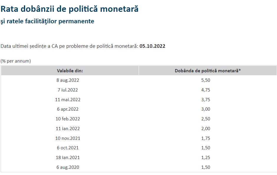 În cursul zilei de miercuri, 5 octombrie 2022, a avut loc un consiliu de administrație al Băncii Naționale a României. În ședința respectivă, s-a discutat despre rata dobânzii de politica monetară, dar și despre rata dobânzii pentru facilitatea de creditare. Potrivit informațiilor, BNR a decis ca rata dobânzii de politică monetară (RPM) să fie majorată la o valoare de 6,25% pe an. Înainte de majorare, rata dobânzii era la 5,50%.