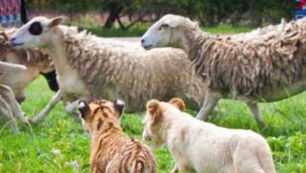 Vezi cum doi pui de leu si de tigru mana la pascut o turma de oi!