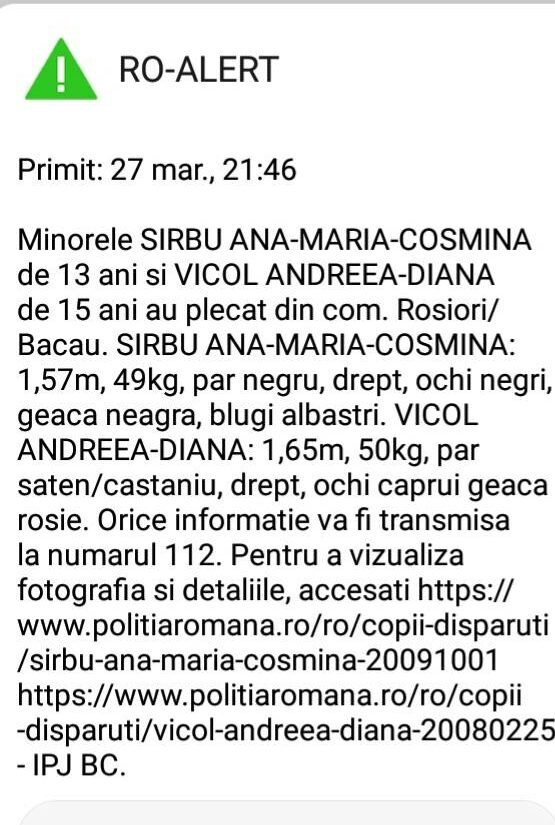 UPDATE: Autoritățile au transmis un mesaj de tipul RO-Alert prin care anunță că cele două tinere au fost răpite. De asemenea, au fost transmise și semnalmentele Anei Maria Cosmina Sîrbu, tânăra de 13 ani la care s-a dus Vicol Andreea Diana. Cine le vede, este rugat să sune de urgență la 112!