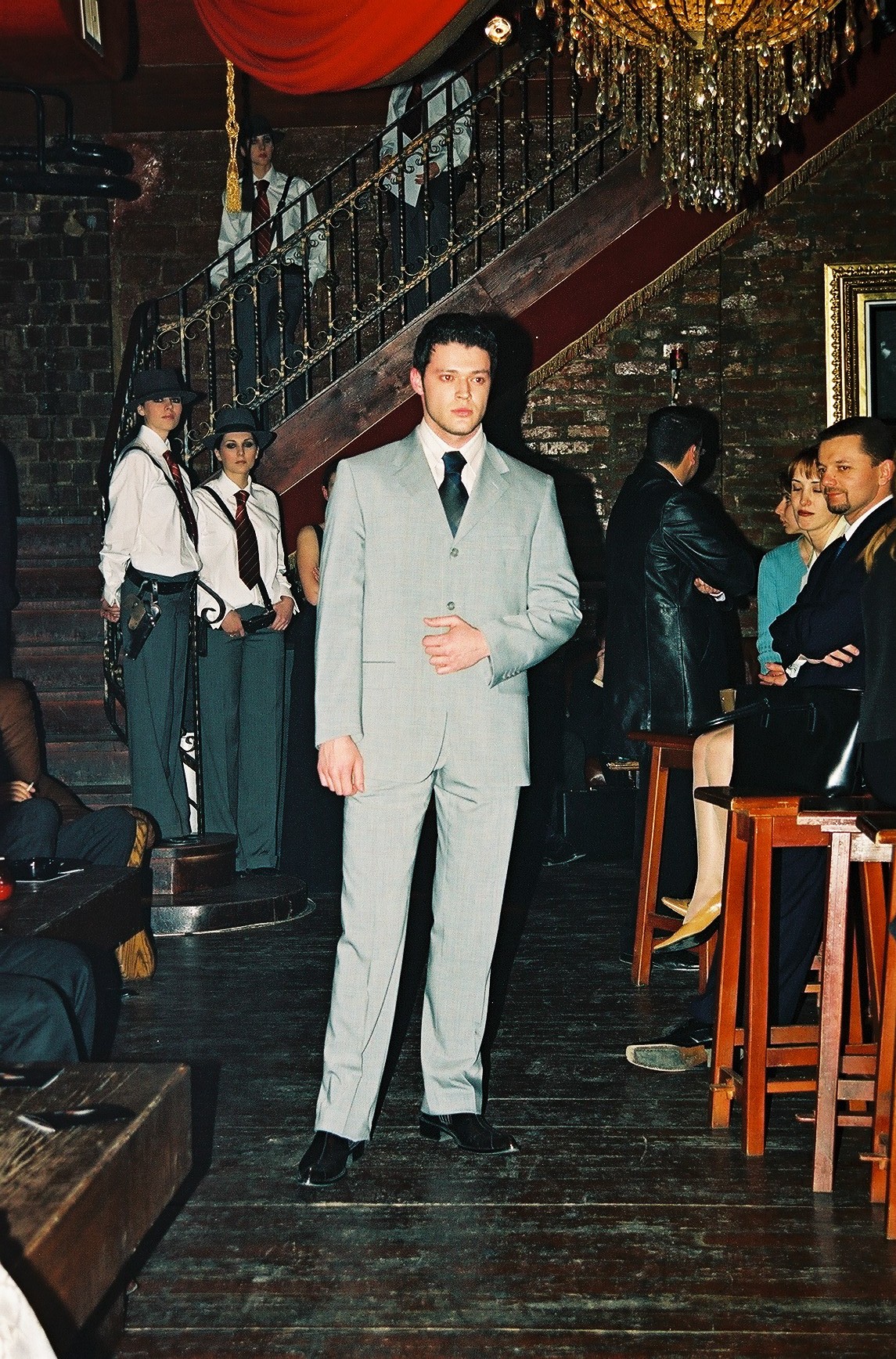 E o petrecere cu iz de mafie interbelică, gen anii ’30, cu domni periculoși și dame cu pistolul la bâu. Numai că Victor pare mai degrabă gata să preia o tură la valet parking decât să conducă o familie de temut din Chicago. Costumul e cam gri pentru un capo vero, prea încheiat la toți nasturii, de parcă urma să servească meniul, nu să împartă ordine.