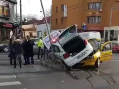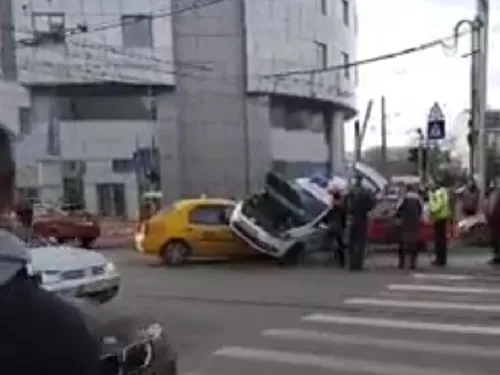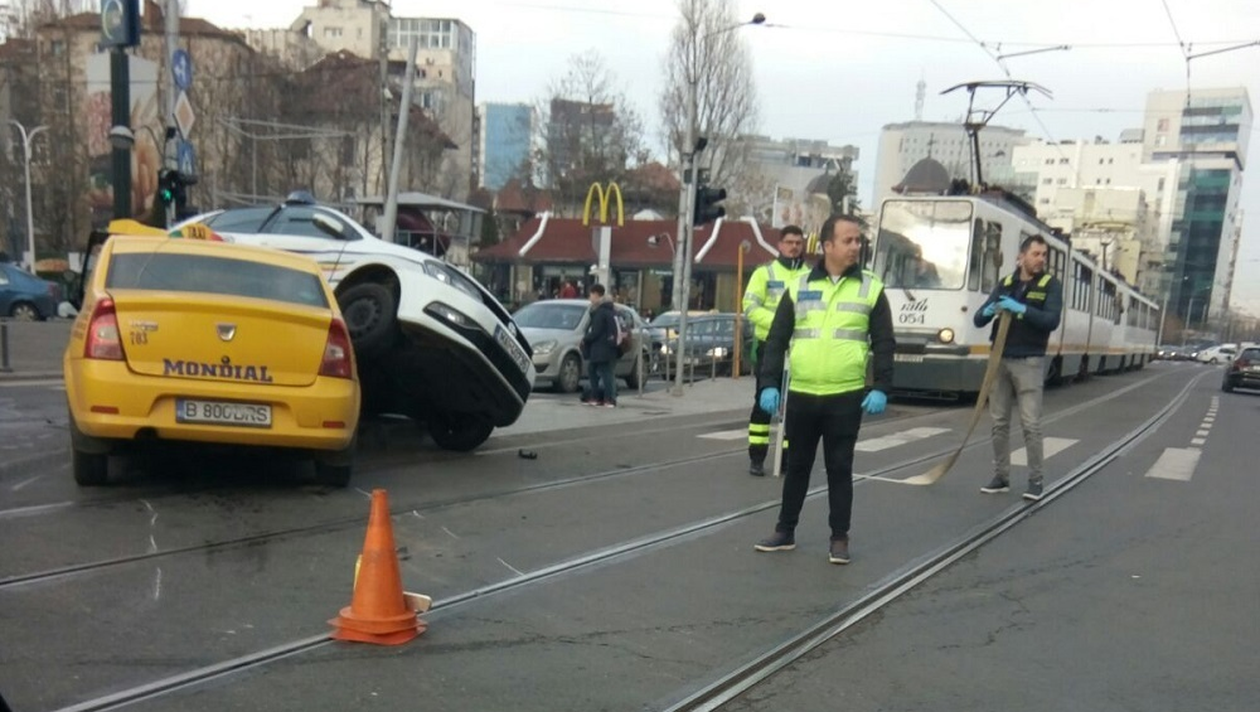 Un incident rutier teribil a avut loc în urmă cu puţin timp în Capitală. O maşină a poliţiei a fost implicată într-un accident spectaculos, iar imaginile filmate de unul dintre martori se observă că, în urma impactului, autoturismul în care erau oamenii legii a rămas suspendat peste taximetru.