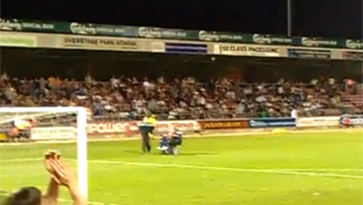 VIDEO Culmea exhibitionismului: Un fan a navalit pe terenul de fotbal intr-un scaun cu rotile